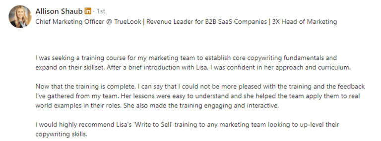 Example one: A call booking dropped into my calendar from a marketing manager at a company in the US. She was looking for copywriting training for her team, came across my Write to Sell training, read the sales page, and booked a call. We chatted for 15 minutes and then exchanged two follow-up emails. Two days later, she’d booked a date and paid the invoice in full. I didn’t need to give her the hard sell or spend hours convincing her to buy from me because my copy had done the hard work. All I needed to do was nudge her over the line.